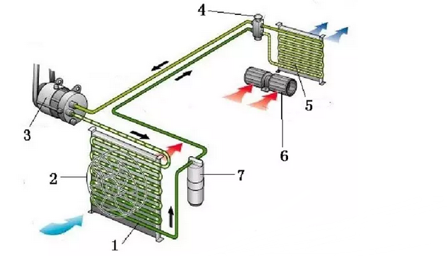 1-冷凝器 2-冷凝風(fēng)扇 3-電磁離合器及壓縮機(jī) 4-膨脹閥5-蒸發(fā)器 6-鼓風(fēng)機(jī) 7-貯液干燥器