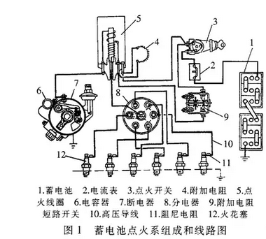 蓄電池點(diǎn)火系包括低壓和高壓電路兩部分。低壓電路由蓄電池(發(fā)電機(jī))、電流表、點(diǎn)火開(kāi)關(guān)、斷電器和電容器以及點(diǎn)火線圈內(nèi)帶有附加電阻的初級(jí)繞組組成。高壓電路由點(diǎn)火線圈的次級(jí)繞組、分電器、高壓導(dǎo)線、火花塞及阻尼電阻組成,如圖1所示。